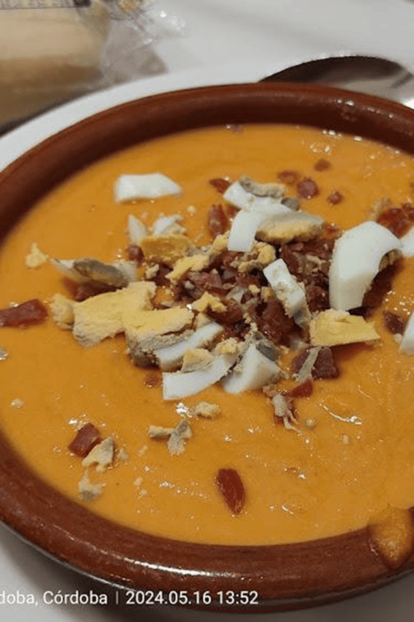 - Salmorejo cordobés: Emblema frío de la provincia: tomate, pan y aceite de oliva virgen extra, espeso y bien emulsionado, servido con jamón y huevo duro. Es uno de los imprescindibles de la cocina cordobesa y aparece de forma habitual en su recetario.